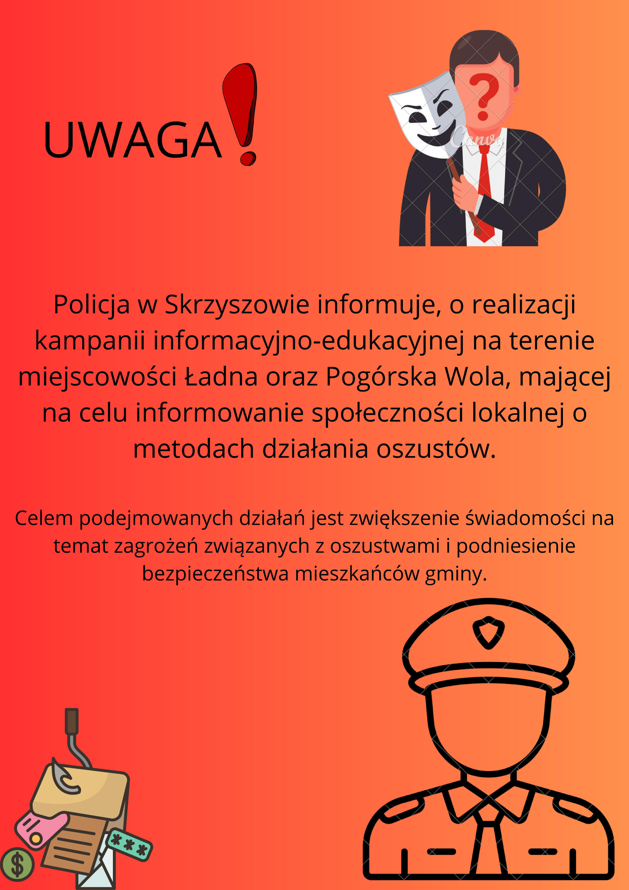 UWAGA!!! Policja w Skrzyszowie informuje, o realizacji kampanii informacyjno-edukacyjnej na terenie miejscowości Ładna oraz Pogórska Wola mającej na celu informowanie społeczności lokalnej o metodach działania oszustów
